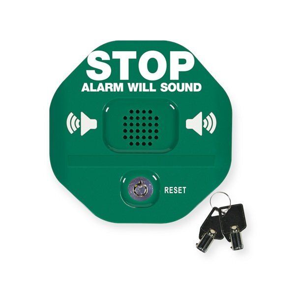 STI 6405-G Exit Stopper met tijdelijke reset. Wanneer de beveiligde deur wordt geopend, knippert de elektronische Exit Stopper en geeft een oorverdovend alarm af (duur geselecteerd door de gebruiker). Een door een sleutel bediende onderdrukking zet het alarm uit en maakt geautoriseerde uitgangen mogelijk. Opties zijn onder meer een vertraging van 15 seconden voordat wordt ingeschakeld of uitgeschakeld, of een automatische uitschakeling wanneer de deur sluit. Exit Stopper "Altijd Actief" model stelt de sleutelhouder in staat om het alarm te resetten, maar staat niet toe dat het alarm wordt uitgeschakeld.